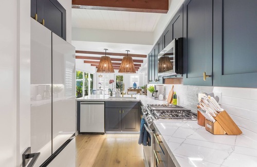 Enter the home that lies beyond your privacy fence and embrace your cozy oasis that envelops you with mature tropical foliage and a refuge from reality. Your light-filled living room beckons you inside with its island chic decor, plush furnishings and a wall mounted TV. Merge indoor and outdoor living spaces when you open your sliding doors to the pool and garden. The streamlined and sparkling kitchen overlooks the living area and captivates your inner foodie with every modern culinary appliance and tool you'll require for crafting festive meals and adult concoctions for your friends and family. The living/kitchen area offers a cafe table for 2 as well as kitchen counter seating for 3. Travel down the bedroom hallway where you'll find a washer/dryer closet. This home is equipped with Youtube TV.