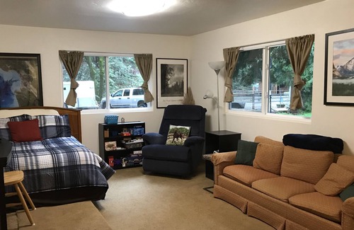 This duplex-style apartment hosts 1 bedroom with comfy queen and full-size beds. Plus a family room with a twin bed and a sofa bed. Conveniently located 10 miles from Los Gatos and 20 minutes from Santa Cruz - with easy highway access, and a peaceful private natural setting. 2 horses in the backyard. Kitchenette includes refrigerator, washer, dryer, and counter top appliances. Gas grill, basketball, horseshoes, and badminton net. No pets. No smoking. Please contact us for multi-month rentals even if the dates show as not-available.