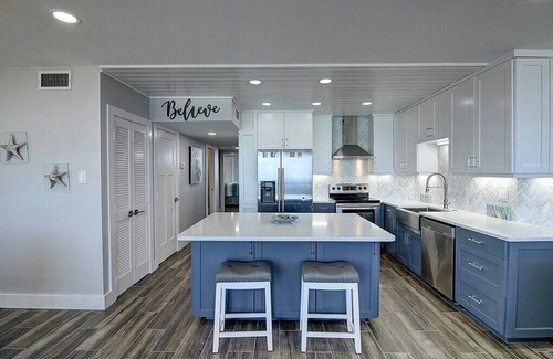 UPDATED - NEW FURNISHINGS! Sea Gull Condominiums unit 908 is a 2 bedroom 2 bath vacation rental with luxurious bedroom ensembles, beautiful high-end furniture and modern décor,. It features a fully equipped open kitchen with granite countertops. You can enjoy your own private patio with fabulous panoramic views of the gulf of mexico. The master bedroom has a gorgeous view of Corpus Christi bay with a plush king size bed. The second bedroom also has a view of the bay with a kind size bed and adjoining guest bathroom with a walk in shower. The unit also comes with 2 twin aero beds for additional sleeping. The living room features modern furniture and a 55' smart TV. The dining room table seats at least 6 with additional seating for 2 at the bar. Condo sleeps 6.