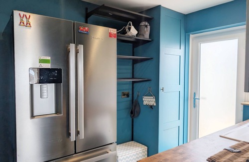 The fully equipped kitchen includes everything needed for a self-catering stay, electric hob and 1 1/2 electric oven, kettle, toaster, microwave, large fridge-freezer and cafetiere. A washer/dryer, iron, and ironing board are also provided for your convenience.