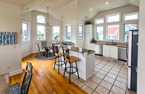 Top Floor: Large Kitchen w/ granite counter tops, 2 ranges, 2 dishwashers, dual oven, large center island w/ range & sink (3 bar stools), breakfast table (4 chairs), dining room table (10 chairs). Spacious living area w/ TV/DVD and home theater surround sound stereo system, gas fireplace (mid-October to mid-May), ocean views, large ocean facing deck (gas grill), powder room, King Master Bedroom w/ TV/DVD, ocean views, dual vanity and jacuzzi tub.