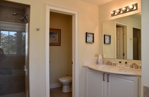 Master #2 has a king-size bed, TV and ensuite bathroom with double sinks, tub, and separate shower.