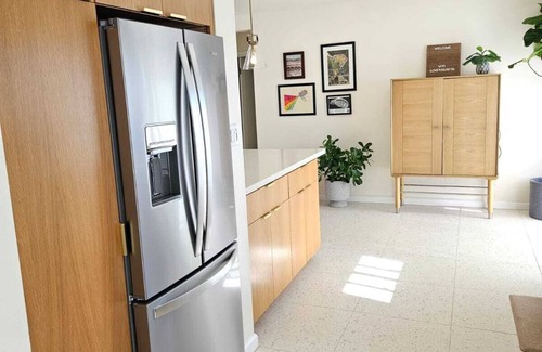 This beautifully redesigned bungalow has been transformed into a modern oasis and is just a short walk to both San Elijo and Cardiff State beach, as well as restaurants, shops, bars, and the local grocery market! It's been designed to make you feel at home and offers max convenience. The space is bright and airy, thoughtfully decorated with all the modern comforts. You can park your car and forget about it for a few days. If you want to venture further, electric bikes are a block away! The yard is spacious and the west facing deck is allows offers you sunny afternoons all year long.