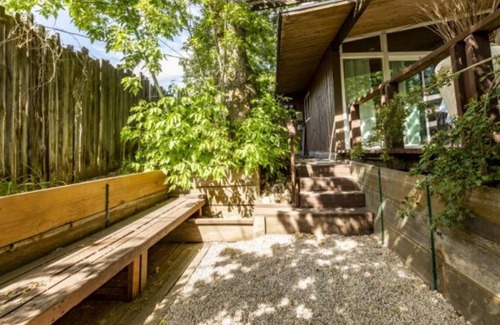 Cozy Mid Century Modern Townhome with Awesome Deck! 2 Bed 1 Bath. Vaulted Wood Ceilings, Stone FIreplace, Wet Room, Butcher Block counter, Lighted Closets, Private Patio off Primary Bedroom. Lots of Storage, 1 Covered Parking Space and 1 Uncovered. Fenced Yard.