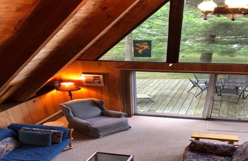 Island Aframe cabin is located just a few steps away from the lake on both sides. Our cabin is on on a 5 acre property on the tip of the island with no neighbors with a nice flat lot just steps away from the water. The cabin has 400' of shoreline, private dock, private beach and fire pit. Watch both sunrise and sunset. Relax outside just feet away from the lake all around you.