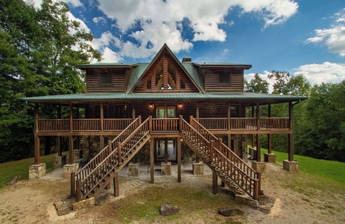 When you pull in to the large flat gravel parking area; the two grand staircases leading up to the front doors highlight the size of this 3 level log cabin. The lower level of this cabin is also accessible from the gravel parking area. Further around to the back yard and the mountains surrounding Fontana Lake come into view. An outdoor hot tub offers a great place to soothe sore muscles from a day of white water rafting while enjoying the mountain view when the stars come out gather around the fire pit to roast marshmallows. The most prominent feature of this log cabin is the large 360 degree wrap around covered porch on the main level. There are many peaceful covered seating areas on the back and side areas of the porch for relaxing and watching the view. A gas grill sits off the kitchen for preparing the perfect steaks.