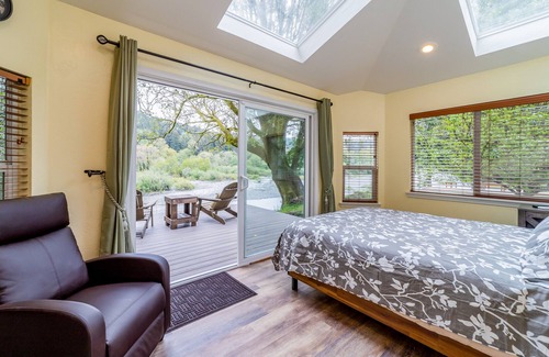 Escape to this beautiful property featuring an inviting two-bedroom main house, a riverside guest studio, and an adorable yoga hut, all of which offer unique sleeping options for everyone in your party. Beginning with the main house, you'll find a sunlit great room with a vaulted ceiling and skylights, a well-equipped, full kitchen with stainless steel appliances, a dining table, and an open living area with plush leather furniture, a warming pellet stove, and a flatscreen TV for streaming your favorite shows and movies.