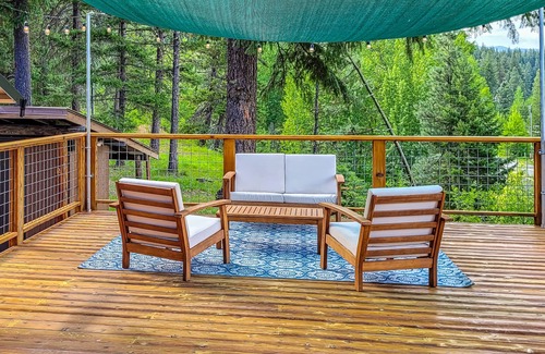 Outside, the deck is huge and overlooks the river, resembling a tree house with its lining of trees. The north end of the deck is covered and offers a cluster of patio furniture for gathering. The south end of the deck offers two patio recliners. The center of the deck offers a dining table and chairs - the perfect spot to end another day at Teanaway River Cabin.