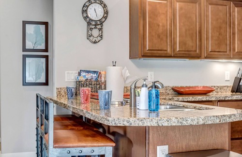 Kitchen: The kitchen space is fully equipped with stainless steel appliances including a gas stovetop, wine fridge, and plentiful counterspace. There's a convenient kitchen island with bar top seating for three.
