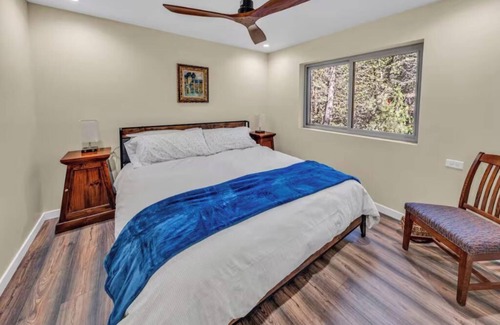 Located on the first floor, with a plush, Brooklyn Bedding Hybrid king-sized mattress. This room features a closet, dresser, nightstands, lamps, ceiling fan and large window with views to the backyard and creek.