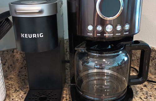 All stainless steel appliances, thick granite counter tops, a fully stocked kitchen with colorful dishes, kid dishes, margarita glasses, wine glasses, a blender, hand mixer, crock pot, food processor, regular coffeemaker, Keurig, rice cooker, and tea kettle. These are just some of the amenities. There is also a stackable washer and dryer for your convenience.