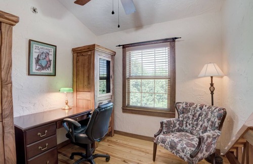 Upstairs, the cabin offers an office area with a desk and extra seating, providing a peaceful corner for those needing to catch up on work or indulge in a good book. The second bedroom features twin beds, a flat-screen TV, and an en-suite bathroom with a large tile shower.