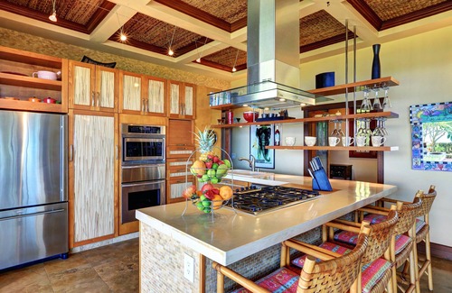 This luxury Balinese 2-bedroom, 2-bath house is tucked away behind tall bamboo foliage that creates a private oasis. Pocket doors open to allow a large indoor / outdoor living area. Lounge chairs under the pool cabana add another relaxing spot to enjoy the large ocean and island views while taking in the cool breezes. Lots of space to relax and soak up the sun. Enjoy the outdoor barbecue area and dining.