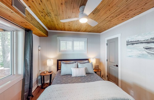 Inside, the upper level will be the hub for gathering and entertaining the whole gang with stylish furnishings, an open layout, uninterrupted lake views, and deck access. The group's chef will be in paradise as soon as they step foot into the full kitchen, with modern appliances, a fun tile backsplash, ample cookware, a Keurig coffee maker, and a large island with bar seating. Not to mention, a wet bar awaits in the living room for preparing your favorite cocktails to sip as the sky changes from blue to orange and pink each evening.
