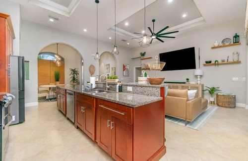 If you’re working remotely or need a quiet space to check in on business, the home features a dedicated workspace with high-speed Wi-Fi — ensuring you can stay productive while surrounded by Florida sunshine.