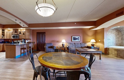 This deluxe resort getaway, a combination of two side-by-side condos, is sure to be a hit with everyone in your travel group! Prepare full-course dinners in the well-equipped, full kitchen complete with stainless steel appliances. Dine at the attached breakfast bar, the nearby, fireside table, or one of two tables for two. The highlight of these condos is the in-room jetted tub where you can soak away your cares after days out exploring the area. Additional amenities include two gas fireplaces and four TVs. And outside, you can take in the view off your furnished balcony or head downstairs to discover the wide variety of on-site amenities that await you and your guests.
