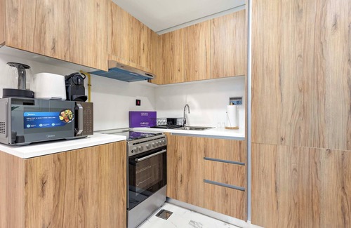 Modern kitchen equipped with essential appliances, including a stove, oven, full-sized fridge, toaster, kettle, microwave, and espresso machine.