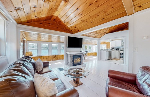 This lovely and spacious vacation rental boasts high, knotty wood ceilings, several windows welcoming in abundant natural light, and an open floor plan. Step into the fully-updated kitchen to prepare all your favorite recipes using the upscale appliances and then dine indoors at the adjacent table or alfresco on your furnished patio while swans, geese, and other native birds play out on the water. Back indoors, switch on the fireplace and settle into the comfortable living area to stream your favorite shows and movies.