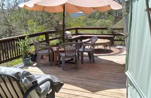 Hidden valley lots of trees hills and open meadows.Great views from deck no city lights so star gazing is great, yurt is round so open living consept bath enclosed open ketchen dinning living room bed area.Large outdoor shower with very large deck on side of a hill. Come feed the deer and gather fresh eggs from chicken house.