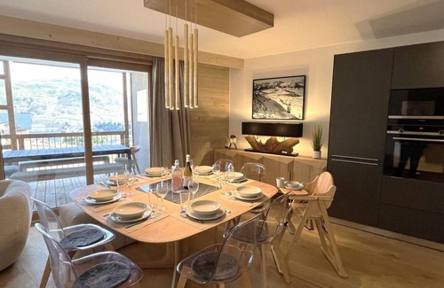 Departure and return on skis, very sunny with nice amenities such as the swimming pool or the gym, the Phoenix residence will welcome you and make your vacation unforgettable. Surface area : about 98 m². 4th floor. Orientation : North, East, South. Living room. Bedroom with shower, double bed, TV. Bedroom with double bed, TV. Bedroom with 2 single beds, TV. Cabin with 2 bunk beds. Kitchen with special heater to prepare La Raclette, 2 coffee machines (filtre et Nespresso), Wine cellar, oven, toaster, washing machine, dishwasher, microwave, 2 induction cooking rings, fridge, dryer. Shower room with shower, WC. Separated WC. Bathroom. The beds in elevation are not suitable for children under 6 years.