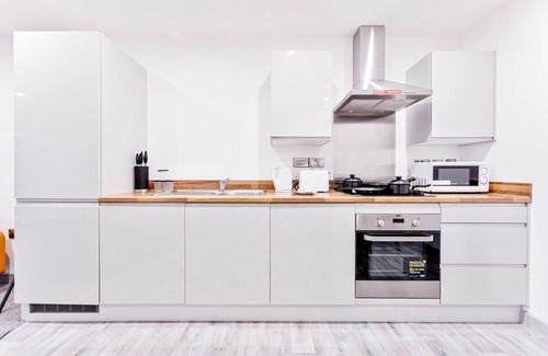 This elegant one-bedroom apartment is designed to a high standard, offering stylish furnishings, modern fixtures, and ample space for up to two guests to enjoy a relaxing stay in the heart of Wolverhampton. The open-plan living area includes a fully equipped kitchen with everything needed for home-cooked meals, a comfortable sofa, and a smart TV. High-speed broadband is available throughout the apartment. The bright and spacious double bedroom provides plenty of storage, a large window, and a comfortable bed with crisp hotel-quality linen. The sleek bathroom features a shower, toilet, and sink, along with complimentary toiletries and soft, fluffy towels for your convenience.