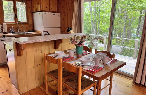 This cottage is located in a lovely setting with woods wrapped around on three sides and a water view. You can see the setting sun over Glen Cove and Little River from the second-floor deck. This two-bedroom cottage has an open kitchen, dining and living area, two bedrooms (queen and full beds) , and a bath on the second floor. The kitchen is fully stocked with everything you need to prepare delicious meals including a drip coffee maker, pots, pans, dishes and all utensils. A cozy gas fireplace in the corner flips on with the convenience of a switch.