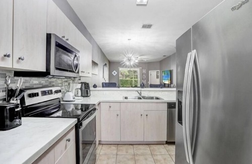 Come and enjoy our luxurious 5 star vacation home located in a gated community. New counter tops, new flooring and new furnishings. This beauty will comfortably accommodate a party of 9 with high speed internet and cable. UPDATED AND. The master bathroom suite offers a jetted tub and a separate shower with dual sinks. The chef inspired kitchen comes fully equipped with a giant breakfast bar that overlooks the living and dining space. Each bedroom is ample size with generous closet space and washer/dryer is included. The community offers 2 pools, spa, playground, recreational center, gym, basketball & tennis court, picnic area & so much more.
