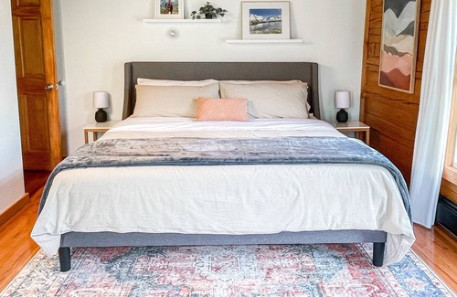 Located 1.3 miles from Kingdom Trails and 10 mins to Burke Mtn, bring your bikes or skis and enjoy a stay at this newly renovated log cabin. Partial Views of Darling Hill, pine forests and set back for peaceful evenings together with your friends and family around the fire pit or on the deck. Complete with 5 bedrooms and 2 full baths, a 2 story great room and a massive dining table. Games, children’s toys, books and even a ping pong table in the basement create a fun spot for families. Thoughtfully designed and staged for comfort and relaxation, we know you will fall in love with Burke, VT if you haven’t already!