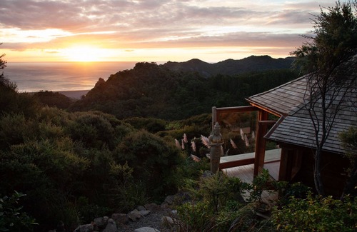 Secluded luxury meditation cabin with uninterrupted vistas of the Tasman Sea, Karekare black-sand beach and Waitakere Ranges rainforest valley, including on-suite private bathroom and basic kitchenette facilities.
