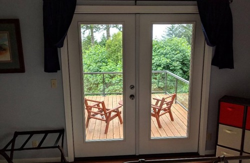 Beautiful Views of the Oregon Coast from this mid century classic home. A updated 3 bedrooms, two full bathrooms, two story charming home that sits on a tree studded hill overlooking the Oregon Coast. The home exterior was repainted in 2023 to match the mid century architecture. Giant ocean boulders placed on the property . Higher end furniture & appliances with a 50-inch flat screen TV with full cable access including HBO and Showtime. Excellent Wi-Fi. A cute cozy deck is accessed discreetly off the living room and the master bedroom. A gorgeous updated and fully equipped kitchen with dual fuel range, modern appliances and wall of windows in the living room that overlook the dunes and the coast .The views are visible from kitchen and the dining room. All 3 bedrooms have full closets and views. Bamboo hardwood flooring throughout the home with great artistic area rug in the living room plus seating for eight in the dinning room. Interesting local wood carvings art on the walls. Heated floors in the bathroom with a tub and both bathrooms have new updated showers. Upgraded central heating. & cooling plus a wood burning stove. Parking for 7 vehicles on the property including large drive way for truck & trailers, a carport and a garage. Grass pads in the rock garden for doggies . Full washer & dryer and a 220 hook up for electric vehicles. Easy slide two pane windows to allow in the gentle coastal breeze. A propane BBQ for you to use, try grilling the locally caught fresh fish! Easy access to the house right off the 101 Hwy.