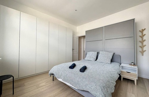 - Une chambre avec un lit double (160*200 cm), un placard à rangement, une table de chevet - stores électriques aux fenêtres