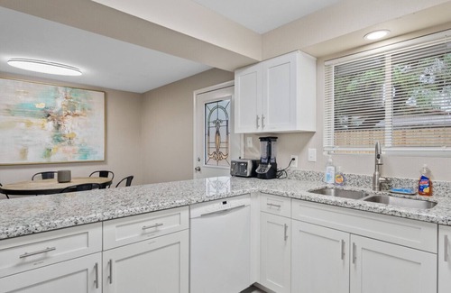 Spacious kitchen, open concept living room and separate dining area directly adjacent to the kitchen. We`ve got what you need to cook, including pots, pans, utensils and appliances. Or feel free to just make a cup of coffee or a smoothie if that`s more your speed. Master bedroom has a King sized bed, guest bedroom has a Queen. Both bedrooms have desks and dressers/nightstands so you can comfortably unpack.