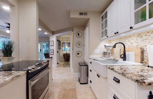 Freshly updated with granite and high-end stainless appliances (incl. washer/dryer). Open-concept den and kitchen have eight sunny windows, king-sized bedroom has four windows.