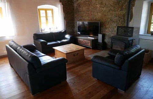 The Jägerhof, a special luxury object of a special kind! Quiet, idyllic,- village location on a southern slope in the beautiful Fichtelgebirge. Perfect for a vacation with a big family or friends. With us you will find pure relaxation and well -being, in the best ambience. Everything you need is in the immediate vicinity. Modern Fewo at the historic Jägerhof with top equipment. Your relaxation and health is important to us. Special highlight: rich wellness offer with relaxing massages, life coaching accompaniment healing fasting and much more can be booked in my practice directly on site. The spacious, light -flooded apartment of 150 sqm includes the entire upper floor. After the entrance area stairs, you will find a spacious, modern kitchen that is integrated into the very large living room. Furthermore, a tiled stove, a wood stove and a cuddly corner for cozy hours - time out for body and soul. 2 bedrooms of it an EL