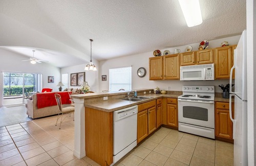Enjoy this beautiful home in the exclusive gated complex of Highgate Park. Take advantage of the perfect proximity to amusement parks, outlet shopping, championship golf courses or just enjoy some much needed piece and quiet. This four bedroom, three bath single level villa sleeps 8 people. Free Wi-Fi internet connectivity is available in the home. Enjoy the screened in private pool, spa and patio. Heat for pool and spa is available for months when temperatures dips at night (additional cost). Located on a corner lot provides a peaceful setting.