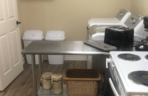 It has 3 bedrooms with comfy queen beds. The first bedroom has an extra sitting area, the second bedroom has a full-size futon for extra sitting or sleeping, and the third bedroom has a desk if you need to work. There are large closets in each bedroom for placing your belongings, a small kitchen with full-size appliances and a washer and dryer.