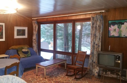 The first floor consists of a large boot room with laundry and generous space for equipment, an open living, dining and kitchen area with ceiling-high windows, and a large curtained bedroom area with full bath and sliding glass door to the back yard. A unique circular staircase takes you to the main floor, with an open floor plan for the kitchen, dining and living rooms. When the weather is nice, the large sundeck provides space to enjoy the outdoors. When it’s cold outside, guests can enjoy the view through another wall of windows, or relax and watch the HDTV with cable. A full bath and main bedroom make up the rest of the second floor. There is also a child's alcove off the master bedroom.