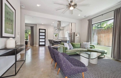 This contemporary home in East Austin can fit up to 11 guests with its 6 bedroom, 3 bathroom, and a short drive to downtown Austin. With its ample amenities, including a private pool, this home is the perfect Austin retreat. The professionally designed spaces offer open-concept layouts and kitchen & dining spaces perfect for entertaining.