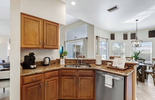 Welcome to your beautiful 3 bedroom gem with outdoor dining for 6 and amazing poolside sunsets. Upon entering the front door you will feel ensconced in the lovely and professionally decorated coastal style living room with dramatically high vaulted ceiling and views of your private pool. Pull up to the breakfast bar with granite countertops and stain steel appliances for breakfast or lunch using this fully equipped kitchen with a full size refrigerator, electric stove, dishwasher and 2 coffee makers (of course one is a Keurig).