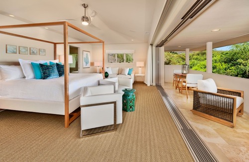 Within Coral Gardens Estate, the lower level of the home focuses on an expansive open-air and very modern styled great room with fully retracting sliding glass walls. The sofa set, kitchen bar counter, and indoor dining table were designed to easily accommodate eight guests. This ocean view living room is framed by an oversized HDTV and sound system. The fully equipped kitchen has top-quality appliances by Wolfe, Bosch and Sub-Zero as well as a separate wine refrigerator, Nespresso and Keurig Coffee Makers, and plenty of food storage space. On the lower level you will also find another third suite with a very spacious bedroom, parlor room, bath, and direct access to the pool patio. Behind the kitchen is a large laundry center, full shower bath, and a queen bedroom.