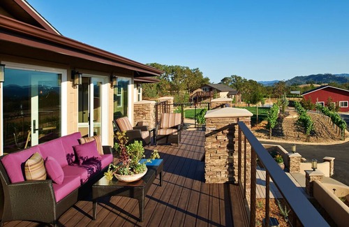 The property was completely remodeled in 2014. The first floor of the main residence consists of two bedrooms which sleep up to four people each, a bathroom, the living room, television sitting area, dining room, and spacious kitchen. The kitchen has all new appliances including an large ice maker and wine cooler. French doors open to the patio with an outdoor dining space and views of the vineyard. Upstairs consists of the family room and big screen television, bar, dining area, a bedroom and bathroom, washer and dryer room, and the master suite. The master suite and family room have french doors leading the the upstairs deck which offers amazing views of our property and the rolling hills and oaks of Templeton in the distance.