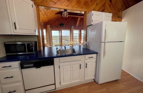 The property boasts two bedrooms-a queen room and a double/twin bunk room--both with sufficient closet space. There is also an additional twin daybed that sits in a nook at the front of the house.. A curtain can be closed across this area to provide an additional private sleeping room--it's really a third bedroom. This area also contains, books, board games, and art supplies for use during your stay as well as additional shelving for your belongings. There is one updated bathroom. The kitchen overlooks the river and has sunset views. It is spacious, fully stocked, and has a new dishwasher and a dual coffee pot--Keurig and regular brewing pot. There are two large empty pantries to store your groceries. The living room is spacious and furnished comfortably with seating for at least 6. There is a wall mounted smart TV for entertainment and a cozy propane fireplace should it get chilly at night during your stay. There are 5 skylights and plenty of windows to let in natural light. A new mini-split provides AC cool you off during hot summer nights. There is a washer/dryer in the home as well as a space to hang your clothes to dry if needed. The deck is equipped with a large sectional couch, a dining table for up to 6, and a Weber grill. The small yard is perfect for games before dinner.
