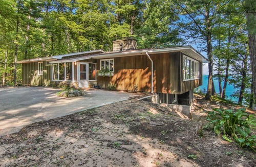 Discover the perfect getaway in Northern Michigan at our recently renovated mid-century modern home, complete with panoramic views of West Bay and nestled on a private sprawling 58-acre property. We invite you to be our guest and relish the charms of this serene retreat, featuring a top-tier chef's kitchen equipped with a 48" Thermador range with dual ovens. A magnificent stone wood-burning fireplace in the living room provides both warmth and ambiance, creating the perfect setting for relaxation and reflection.