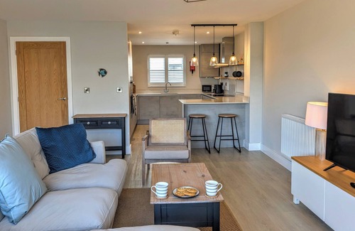 The living area is a bright and airy open space, with a kitchen, lounge, and dining spot. The kitchen has everything you need for an easy and comfortable stay, with the lounge and dining space ideal for relaxing and entertaining. Pull back the fully folding glass doors and step out into the patio and garden. Here there is more furniture for everyone to socialise and a good sized garden for pups and kids to play.