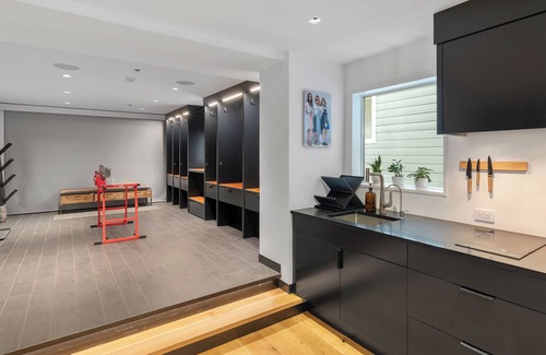 Upon entering the home, you’re greeted by a luxurious après lounge designed for relaxation and socializing. Guests can enjoy a drink from the kitchenette’s beverage and wine fridge, while the shoes-off policy encourages a laid-back atmosphere. The home is equipped with complementary recovery slides, boot dryers for skiers, and shoe trays for hikers, ensuring that everyone can unwind comfortably after a day of outdoor adventure. The spacious drop zone includes cubbies and ample space for gear storage.