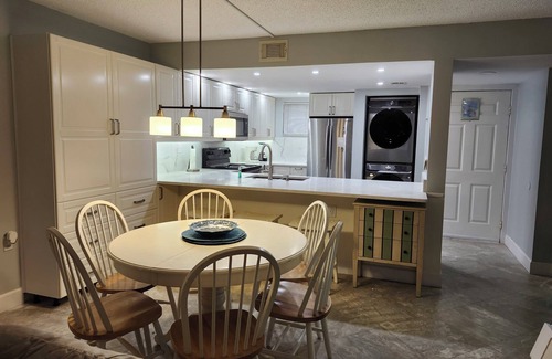 The Dining area comfortably seats 6 with room to squeeze in 2 more when needed. The kitchen includes a stainless steel Fridge/Freezer, Stove, Microwave, and Dishwasher. Keurig coffee (courtesy coffee pods included: 1/adult/day). There is a stacked Washer/Dryer inside a closet next to the fridge.