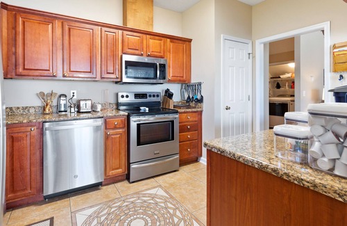 Less than six miles from the beach, this two-level home is ideal for spending a fun vacation with the people you love. The first level enjoys a spacious open concept between the living, dining, and kitchen areas, and you'll love the vaulted ceilings and attractive hardwood floors when you hang out to watch your favorite movies and shows on the TV. There's nothing like preparing a delicious meal for the gang, so head into the full kitchen to take advantage of the stainless steel appliances and granite counter space to work on your next masterpiece. You can serve everyone at the expandable dining table while the kids chatter away from the breakfast bar stools. Off the dining area, the porch is a great place to enjoy a delightful brunch while catching up with old friends. With shops, restaurants, activities, and the beach all nearby, you'll love tomorrow's next adventure. Don't forget to use the private washer/dryer to keep everyone looking their best and the free WiFi to post your favorite memories on your social media.