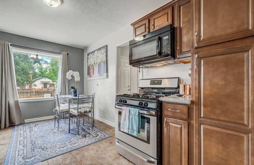 This one bedroom, one bathroom home offers convenience for your travels with the addition of the desired amenities you need. The bedroom offers a comfortable nights rest on the comfy queen mattress and easy access to the homes full bathroom. The kitchen is fully stocked with the essentials to make your stay feels as though you are right at home! Unwind in the living room streaming your favorite TV shows and movies on the Smart TV or if needed, there is a dedicated workspace with monitor and printer so you can work from home comfortably. Head out back to the private backyard and enjoy the evening weather around the firepit or grilling a delicious BBQ. The home also offers the convenience of a full-sized washer and dryer at your disposal. Whether you're here for work or leisure, you're sure to appreciate the beautiful Colorado outdoors and the comfort of this lovely cottage.