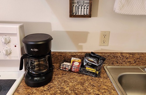 Part of Beargrass Lodging & RV Resort, this unit is part of a fourplex building. Unit #9 is a studio layout with 1 King bed and couch in the living room. Full kitchen with dining table/four chairs. Dishes, pots and pans provided. Basic pantry supplies includes salt, pepper, sugar, cooking spray, foil, plastic wrap, tea, coffee, and coffee filters. Full bathroom with tub/shower. Highchair and pack-n-play available upon request. Room is NOT pet friendly.