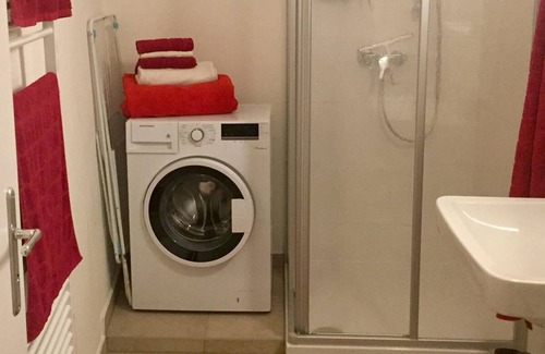 The separate bathroom is equipped with a large shower, a towel radiator, a washing machine, a hairdryer, and a vanity with a mirror.